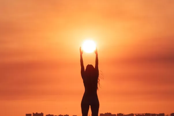 woman standing on beach with arms in the air